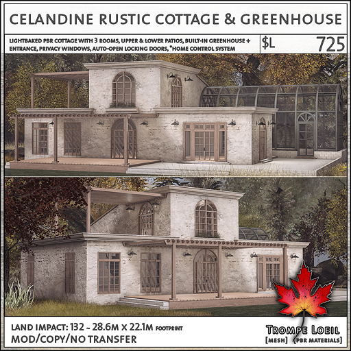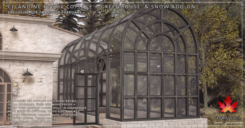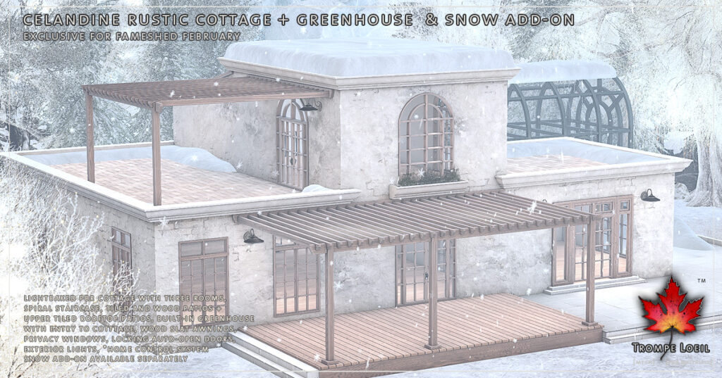You can’t have too much sun, so we’ve built the greenhouse into our new Celandine Rustic Cottage! This lightbaked PBR rugged plaster and brick worn exterior cottage features a tiled and wood multilevel patio with wood awnings that leads to a 2 story, 3 floor warm plaster cottage. Around the back, the dark green metal greenhouse with brick base and tiled floor is waiting for your patio set or your plants – and has its own entrance into the cottage! A matching spiral staircase inside leads to the upstairs room with dual rooftop balconies and loft overlook, topped with a tilted skylight for even more sun. Grab the Snow Add-On to get you through the last few weeks of winter! Land Impact is 132, and footprint is 28.6 meters by 22.1 meters. Only at FaMESHed February!