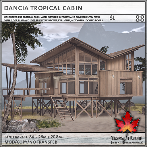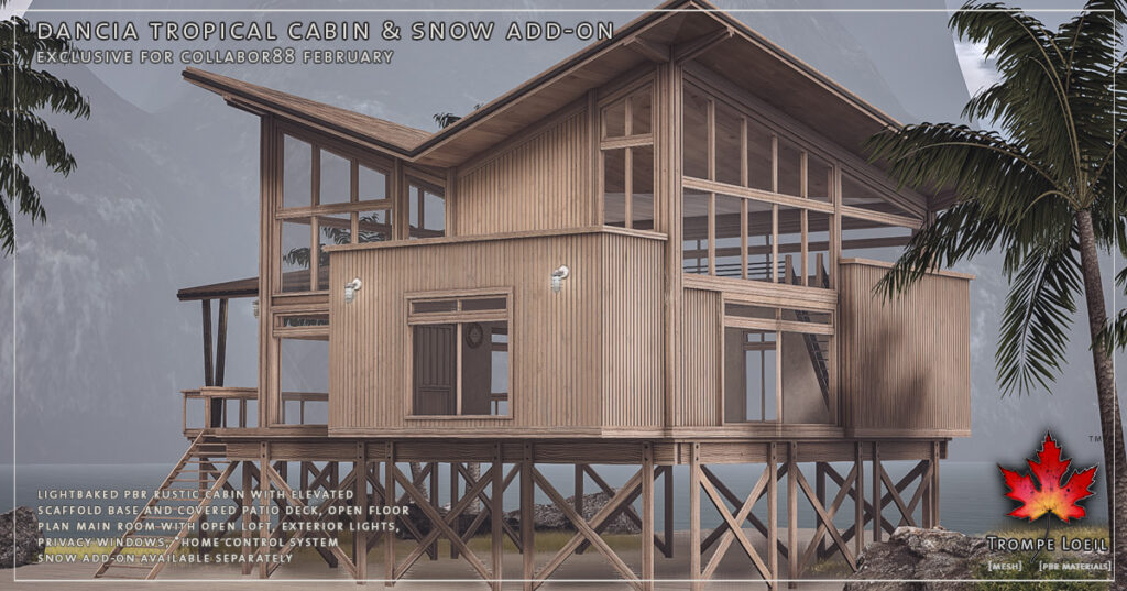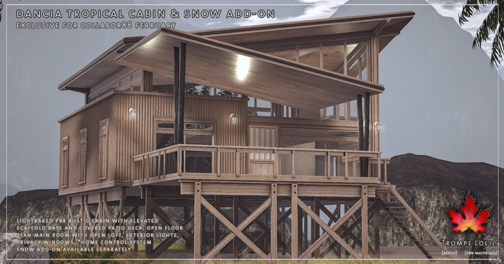 Ready for a little sunshine? Escape to the beach in the Dancia Tropical Cabin! This PBR lightbaked build features elevated construction perfect for land or shoreline, with an elevated covered deck leading into the open floor plan main room. Upstairs an open loft area and tons of windows lend a breezy air. Natural wood construction outside and lightly textured walls inside make this a visual treat from all angles. Grab the Snow Add-On in case a storm blows in! Land Impact is 84 and footprint is 26 meters by 20.8 meters. At a great low C88 price for February’s round!