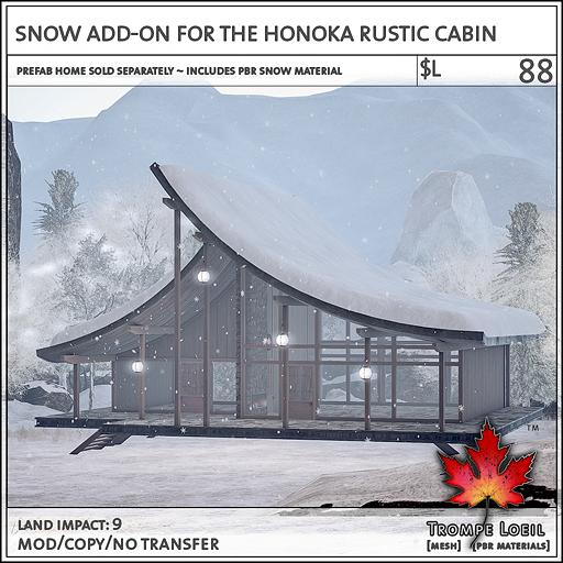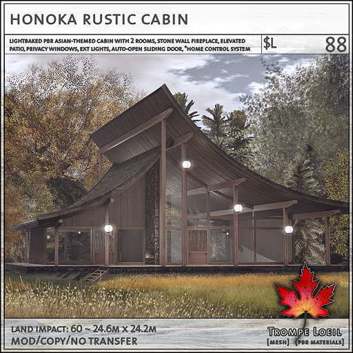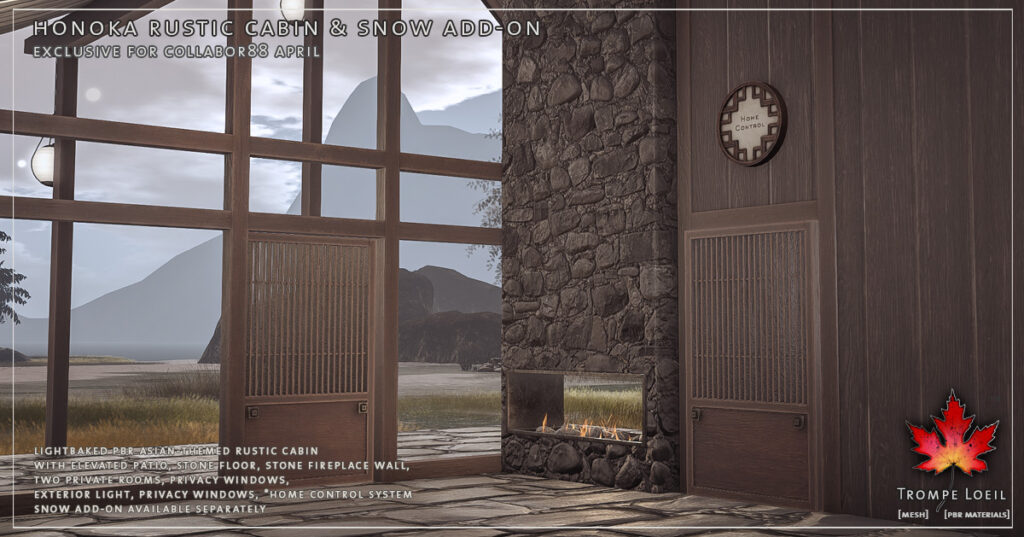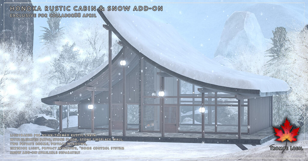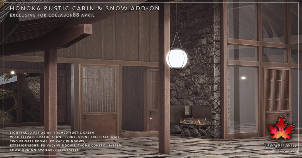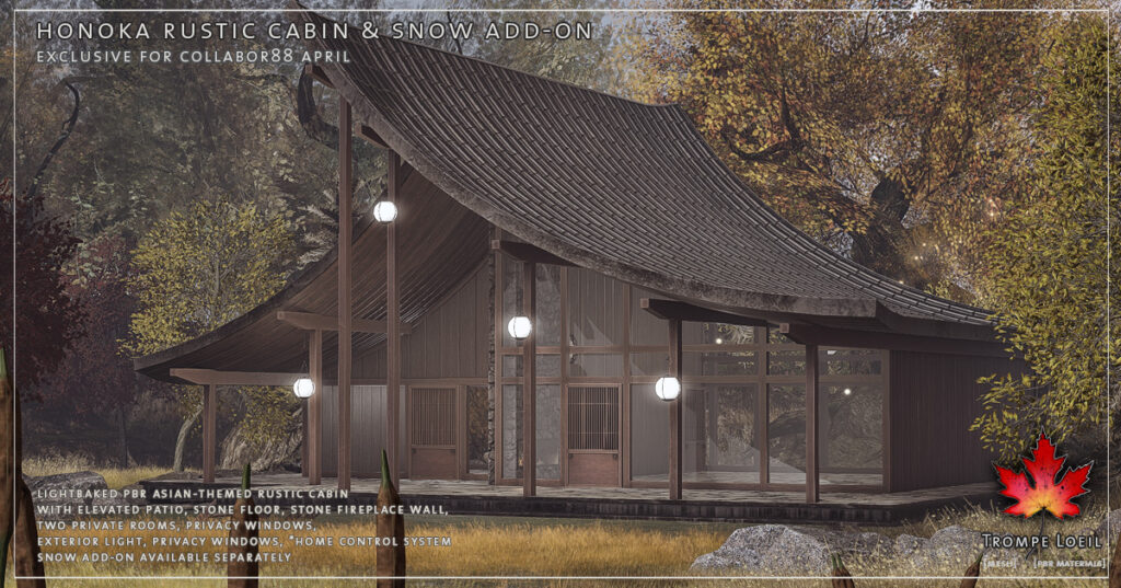 The new Honoka Rustic Cabin for Collabor88 April is a Japanese-inspired rustic cabin build, using natural stone and worn wood and a sweeping roofline to create a lovely springtime escape. The elevated natural stone patio is supported by worn wood beams, with the angles echoed in the graceful curves of two rooflines connecting to shelter a 2 room cabin underneath. Lots of windows bring in the outside, while supporting walls of natural worn wood provide privacy. Hanging ball lamps provide a magical touch and gentle glow. Sliding doors can be set to auto-open scan with our *home control system, in addition to privacy shades and external light controls. Land Impact is 60, and footprint is 24.6 by 24.2 meters. Grab the matching Snow Add-On for winter’s return! At a super low Collabor88 price for April’s round!