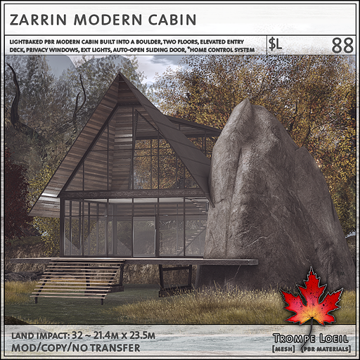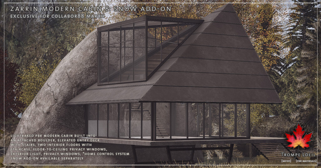 Stark nature anchors a sleek dark modern cabin with glass galore – the Zarrin Modern Cabin makes a statement anywhere! We took an oversize natural granite boulder and used it as the structural foundation for a dark metal and natural olive wood modern cabin, with two floors joined by interior staircase and a pop-out glass upper atrium. Accessible via the elevated deck and stairway, enjoy 270 degree upper level views of your natural landscape. Grab the snow add-on for a little touch of winter! Land Impact is 32, and footprint is 21.4 meters by 23.5 meters. Only at Collabor88 March at a great low C88 price!